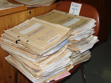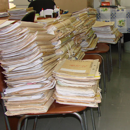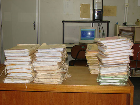 Sem espaço suficiente, processos são espalhados pelo chão, cadeiras e sobre as poucas mesas de trabalho