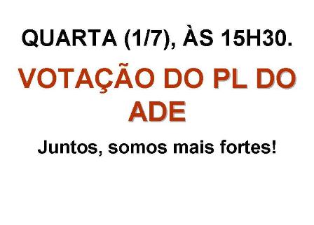 A assessoria do deputado Délio Malheiros (PV) relator do projeto do ADE (PL 2968/09) na Comissão de Administração Pública da ALMG, confirmou ao SERJUSMIG que o PL foi incluído na pauta da sessão extraordinária marcada para amanhã, quarta-feira (1/7), às 15h30.