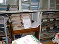 Um espaço minúsculo e sem qualquer proteção serve de arquivo, no qual são guardados processos, material de limpeza e armas.