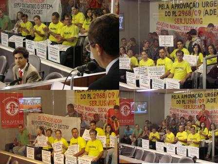 Antes de abrir a sessão, os representantes do SERJUSMIG conversaram com o assessor do relator do PL, Deputado Délio Malheiros, a fim de verificar se a emenda que corrigia a data relativa ao pagamento do retroativo (projeto previa 2008 e não 2009) estava contemplada no relatório.