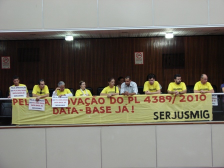 Dirigentes do SERJUSMIG, acompanhados de Servidores, estiveram presentes no plenário da ALMG na tarde desta quinta-feira (6/5), para acompanhar a votação em primeiro turno do PL 4389/2010 (data-base, com revisão geral salarial).