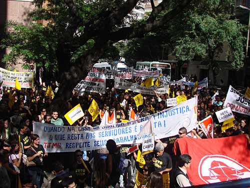 Durante o protesto, os Servidores fizeram uma passeata no quarteirão onde se situa o TJMG. Ao se aproximarem da janela da Corte Superior (onde acontecia a votação sobre a minuta do ADE), os manifestantes levantaram as bandeiras e em coro clamaram por “Justiça na Casa da Justiça”. Os gritos puderam ser ouvidos por todos que acompanhavam a sessão da Corte, afirmaram colegas que estavam dentro do Salão.