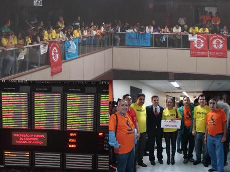 O projeto, que começou a tramitar no dia 22, teve várias reviravoltas. Durante a tramitação, em virtude das negociações entre o Governo e a oposição sobre o Projeto dos Servidores da Educação, os Servidores do Judiciário mineiro tiveram que ter muita paciência e, acima de tudo, persistência para garantir o reajuste. E valeu a pena: No dia 25, embora exaustos, os Servidores presenciaram o resultado de muito trabalho e luta: o projeto foi aprovado.