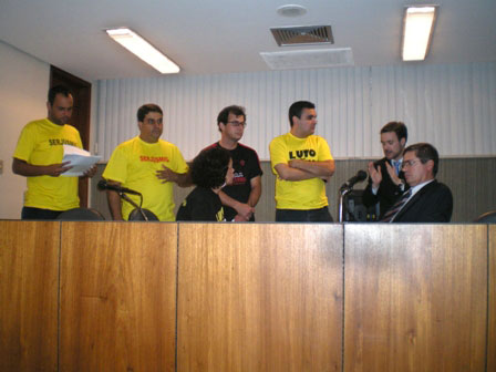 O SERJUSMIG parabeniza os atuantes servidores que foram à Casa Legislativa, nesta tarde de quarta-feira, 10/11/2010, a fim de ajudar na pressão em prol do SIM ao PL 4631/2010 (que institui a exigência de Nível Superior para ingresso no cargo de Oficial de Justiça). Infelizmente, mesmo com a presença dos trabalhadores, no Plenarinho IV da Assembléia Legislativa (ALMG), dando reforço à pressão do SERJUSMIG e do Sindojus, o PL não foi apreciado na “Reunião Extraordinária”. Esta, aliás, só teve o PL pautado graças à intervenção dos sindicalistas. Como na “Reunião Ordinária”, realizada ontem, 9/11, o PL não havia sido pautado, os representantes da categoria foram à ALMG negociar com deputados. Em razão disso, o projeto entrou na Pauta desta Extraordinária de hoje, 10.. Assim que soube disto, o SERJUSMIG (pelo site) convocou os colegas para fortalecer a pressão na ALMG.