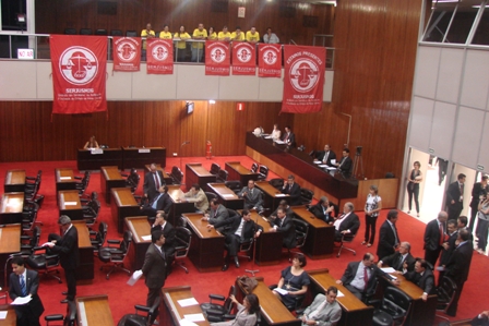 Ufa! Depois de votado na Comissão de Administração Pública (CAP), ontem à tarde, o PL 5038/2010 (que prevê o Adicional de Periculosidade para Assistentes Sociais; Comissários da Infância e da Juventude; Psicólogos e Oficiais de Justiça) foi pautado para votação, em primeiro turno no Plenário, onde, na manhã de hoje (14/12) foi aprovado. Ainda no período matutino, o PL seguiu para a Comissão de Mérito (CAP), onde teve aprovado o relatório. Agora, ele está pronto para ser apreciado, em segundo turno, no Plenário da Assembleia Legislativa de Minas Gerais (ALMG). Em todas essas etapas, o SERJUSMIG não dormiu no ponto. Estava lá, vigilante e atuante, defendendo o NOSSO PL 5038/2010. Tanto que chegou a montar uma “Tenda Vigília”, na Porta da ALMG, onde, quando o PL corria riscos, encenou o velório dos direitos dos Servidores, distribuiu banana para a população (em referencia à atitude que o TJMG vinha tomando em relação ao assunto), despertando, assim, o interesse de parlamentares, e do próprio Tribunal, em solucionar a questão. |