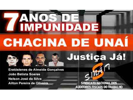 Uma manifestação contra a IMPUNIDADE é realizada na manhã desta sexta-feira, 28 de janeiro de 2011, em frente ao Tribunal Regional Federal (TRF) da 1ª Região, em Belo Horizonte. O protesto, que relembra sete anos da Chacina de Unaí (MG), é organizado pelo Sindicato Nacional dos Auditores Fiscais do Trabalho (Sinait) e pela Associação dos Auditores Fiscais do Trabalho de Minas Gerais (AAFIT/MG). O protesto é para, mais uma vez, pedir a punição dos envolvidos no crime. O SERJUSMIG endossa o coro dos colegas auditores e se solidariza com esta batalha por EFETIVA JUSTIÇA! Segundo nota do Sinait, o protesto terá a presença de familiares das vítimas; sindicalistas; autoridades; políticos e Auditores Fiscais do Trabalho de todo o Brasil.