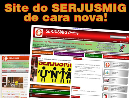 Página de abertura do site antigo.serjusmig.org.br com novo layout. Estamos, paulatinamente, empenhando-nos em aperfeiçoar os instrumentos de comunicação do SERJUSMIG. Com tal propósito, agora, os servidores (as) da Primeira Instância do Tribunal de Justiça de Minas (TJMG) têm um novo visual na página de entrada de NOSSO portal na Internet. Essas primeiras alterações abrangem apenas a aparência, e têm o objetivo de organizar melhor a distribuição do conteúdo no espaço, bem como de tornar a navegação mais fácil e ágil. Intencionamos, ainda, nos próximos meses, aos poucos, fazer outras mudanças. Algumas serão de caráter mais leve, outras tendem a ser mais densas ( poderão vir a abranger, até mesmo, o conteúdo de alguns links e seções do site: inclusive com acréscimos e/ou supressões). Tais alterações, entretanto, serão feitas vagarosamente, uma vez que precisaremos checar /gerenciar um vasto conteúdo.