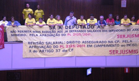 Na noite de terça (4/10/2011), sob os olhares atentos de Servidores(as) da Justiça Mineira, incluindo companheiros(as) do interior do Estado, da 1ª Instância, que estão participando de um curso da Escola Judicial (Ejef), o plenário da Assembléia Legislativa (ALMG) aprovou, em 1º turno, o Projeto de Lei (PL) 2125/2011 (nossa revisão-geral salarial de 6,51%, com retroatividade a 1º de maio deste 2011). Atendendo aos anseios dos Servidores presentes, os parlamentares inverteram a pauta, votando e aprovando o nosso PL. Representantes do SERJUSMIG e do Sinjus-MG acompanharam a sessão Extraordinária do Plenário (iniciada por volta das 20h) e vibraram com a votação.