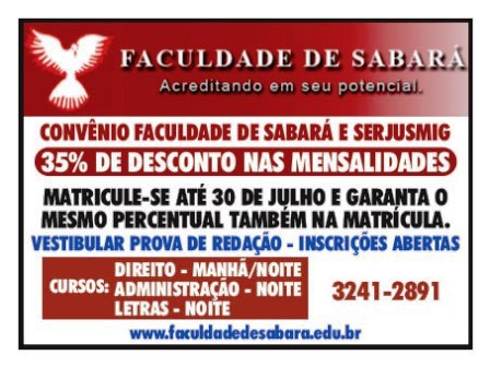 A Faculdade de Sabará, entidade de ensino com 14 anos de atividade, está oferecendo descontos (35%) para associados SERJUSMIG, e seus familiares, nos cursos de Direito e Administração. Os descontos incidirão sobre as mensalidades (excetuando-se a matrícula). Vale ressaltar que, no Conceito do Ministério da Educação (MEC), o Curso de Direito da Instituição está avaliado entre os melhores do Brasil, tendo recebido nota 4 (a escala do MEC é até 5). A Faculdade fica no histórico município que dá nome à Instituição de ensino (cidade que guarda algumas jóias arquitetônicas do Barroco Mineiro). Localizada na Região Metropolitana de Belo Horizonte, Sabará se distancia apenas 25 quilômetros do Centro Capital Mineira. O Campus está situado na Av. Expedicionário Romeu J. Dantas - Nº 1.084 - Bairro Caieira |