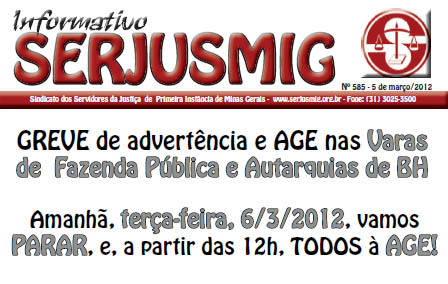 HOJE, 6/3/2012 (terça-feira), é dia de ”GREVE DE ADVERTÊNCIA”, no prédio que abriga as Varas da Fazenda Publica Estadual e Autarquias de Belo Horizonte. Apenas os plantões para atendimento de medidas urgentes funcionarão (o equivalente a 30% dos/as profissionais de cada Vara). Quem estiver parado NÃO registrará o ponto eletrônico, mas assinará o PONTO PARALELO do SERJUSMIG. Mais: conforme deliberado na Assembleia Geral (AGE) da categoria (realizada dia 29/2), nesse mesmo dia da GREVE, 6 de março, a partir das 12h, os servidores e as servidoras daquele prédio farão uma nova Assembleia na calçada do edifício (Rua Gonçalves Dias, 1260 – Praça da Liberdade. Leia o Boletim de convocação da AGE, clicando aqui). Nessa nova AGE, a categoria deverá conhecer o laudo do perito independente, indicado pelo SERJUSMIG, e poderá deliberar a continuidade (ou não) da GREVE, assim como debater ações futuras (em prol de SEGURANÇA, SALUBRIDADE e TRANQUILIDADE para trabalhar). Entretanto, o que o SERJUSMIG e os(as) profissionais esperam é que, até o horário da AGE (12h), o Tribunal de Minas (TJMG) apresente um LAUDO OFICIAL que lhes garanta tranquilidade e segurança para trabalhar (algo que não foi conseguido até momento com as “respostas”, até então, dadas pela Casa – retornos que não contemplam as perguntas que temos feito – algumas das quais disponíveis ao final deste texto).