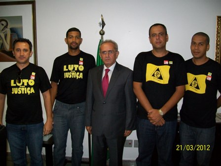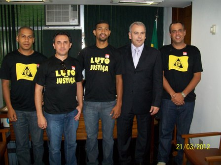 BRASÍLIA - nos dias 21 e 22/3/2012 (quarta e quinta), os Oficiais de Justiça Alípio Braga, Marcelo Cláudio (Ibirité), Josué Roberto (Santa Luzia) e Juarez Oliveira (Betim) representaram o SERJUSMIG nas ações do “Dia Nacional de Lutas dos Oficiais de Justiça. O “ponto alto” da mobilização foi a “Audiência Pública” sobre o Projeto de Lei Completar (PLC) 30/2007” (que dispõe sobre o Porte de Armas aos Oficiais de Justiça e a outros agentes públicos), que foi realizada, na quinta 22/3, na Comissão de Direitos Humanos do Senado. NOSSOS representantes acompanharam a “Audiência”. Na oportunidade, os Oficiais Mineiros ouviram as considerações dos membros do Ministério da Justiça (MJ). Estes ressaltaram ainda não haver consenso para a aprovação do citado PLC.