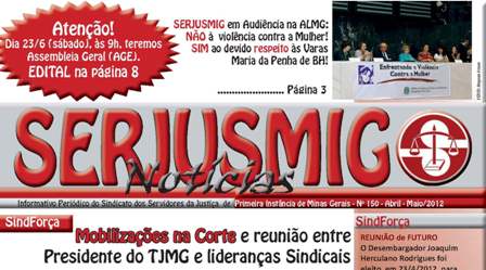 Esta semana começa com a distribuição da mais recente edição do NOSSO jornal SERJUSMIG Notícias número 150. Esta publicação traz como destaques as mais recentes mobilizações da categoria da Corte (dias 23 e 30/5) e seus resultados; as reuniões entre o NOSSO Sindicato e os Presidentes (atual e futuro) do Tribunal de Minas (TJMG), e também o interlocutor da atual Presidência Casa. O jornal destaca, ainda, o Encontro Regional realizado em Araxá; as mais recentes visitas de representantes do SERJUSMIG a comarcas do interior e muito mais. Chamamos atenção para a publicação do EDITAL da NOSSA próxima Assembleia Geral Extraordinária (AGE), a ser realizada no dia 23 de junho (sábado), a partir das 9h, na Associação Médica de BH, que está em destaque na página 8 do NOSSO jornal (edital publicado também no Diário Oficial Minas Gerais de 7/6/2012). Além da versão impressa, que chega aos(às) servidores(as) pelos Correios, é possível conferir NOSSO periódico número 150 também online, no arquivo PDF disponibilizado na página do SERJUSMIG na internet. Para acessar o PDF do SERJUSMIG Notícias 150 e já ir se inteirando sobre as principais questões que afetam a categoria, assim como conferir o EDITAL da próxima AGE da Primeira Instância, clique aqui |