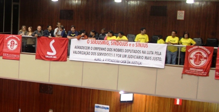 A destemida luta dos servidores e servidoras do Tribunal de Justiça de Minas (TJMG), liderada pela união dos Sindicatos (SERJUSMIG, Sinjus-MG e Sindojus) em torno da PAUTA UNIFICADA, trouxe, nessa quinta, 12/7/2012, uma primeira e importante conquista neste ano: a Assembleia Legislativa (ALMG) “bateu o martelo” num dos pontos de tal pauta, ao aprovar, definitivamente (em segundo turno), o Projeto de Lei (PL) 3298/2012, referente à NOSSA DATA-BASE (5,1%, retroativos a 1º/5 deste ano). NOSSA união (dos sindicatos e dos servidores/as); persistência nas reuniões; nas sessões da Corte, bem como nas ações e vigílias (no TJ e na ALMG) foram muito importantes nessa bem-sucedida trajetória. Dessa NOSSA mobilização contínua frutificaram avanços (a aprovação do PL na Corte. Depois, o envio da mensagem acrescentando, ao PL da suplementação, valores para pagar a Data-Base: relembre aqui); a tramitação em regime de urgência na ALMG (no qual os prazos regimentais caem para a metade do tempo, o que possibilitou que o PL passasse por três comissões em um só dia, e fosse concluído em tempo recorde no Plenário). Tudo! Tudo foi importante. Assim como é IMPORTANTÍSSIMO não ficarmos apáticos após tal conquista, e sim usá-la como impulso para continuar as ações. Afinal, ainda há muita luta pela frente (reajuste escalonado, GEC, diligências, Plano de Carreiras etc.). A VITÓRIA em relação ao PL da Data-Base (e também da Suplementação e das Emendas à LDO: relembre aqui) mostra que ESTAMOS NO CAMINHO CERTO. Então, vamos nos manter firmes e, juntos, construir um Judiciário melhor, que respeite e valorize seus servidores(as). Confira, a seguir, um resumo das lutas que culminaram na VITÓRIA do PL da Data-Base na ALMG.
