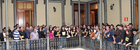 CORTE – 24/4 - Primeira mobilização sob a PAUTA UNIFICADA: a categoria se concentra e faz Ato Público na porta do Anexo II da Unidade Goiás do TJ, e segue até o salão do Órgão Superior do Tribunal para acompanhar a sessão e “mostrar a cara” na luta pelos DIREITOS. 23/5 - Mais uma ação na Corte (foto acima): centenas de Servidores(as) lotam a reunião, a fim de lembrar aos desembargadores de pautados e aprovados seus DIREITOS (Data-Base; Reajuste Escalonado e Prêmio por Produtividade) na Corte, de forma a serem encaminhados, urgentemente, para o Legislativo Estadual (ALMG). Após a Corte, o então Presidente da Casa, Desembargador Cláudio Costa, recebe os líderes sindicais para prestar esclarecimentos. Relembre esta reunião clicando aqui. 30/5 - Nova manifestação na Corte Superior do TJMG, servidores são comunicados que apenas a Data-Base 2012 está garantida, mas ainda sem estar devidamente ajustada a questão da suplementação para saldá-la. 13/6 - Os Sindicatos convocam, e categoria volta à Corte. Cláudio Costa conversa com as lideranças sindicais e garante que a suplementação destinada a pagar a revisão geral já está na Secretaria de Planejamento (Seplag) do Executivo, e que vai pautar o anteprojeto da Data-Base na Corte de 27/6 (última reunião presidida por ele). Sindicatos decidem intensificar ações e deliberam: TENDA VIGÍLIA na porta do Anexo II. 18/6 - Início da VIGÍLIA, com tenda, banneres, faixas e concentração diária de servidores (entre 18 e 27/6: data da Corte)