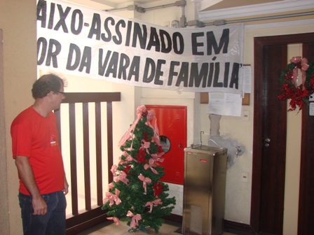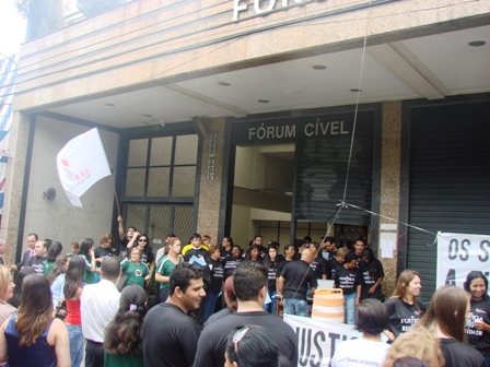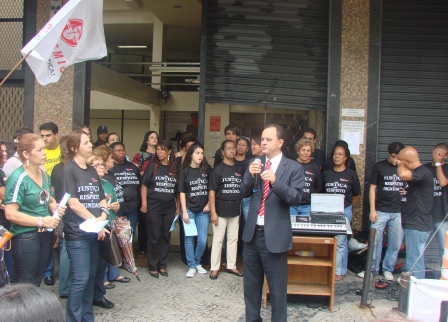 O SERJUSMIG, representado por sua Presidente, Sandra Silvestrini e os Vices Luiz Fernando e Rui Viana, e contando com a colaboração de alguns funcionários, participaram, no início desta tarde de quarta-feira, 12/12/2012, do ”Ato de Protesto em Frente ao Fórum Cível de Betim”. A mobilização, que uniu, entre 12h e 14 horas (resistindo inclusive nos momentos de chuva), o NOSSO Sindicato, os(as) Servidores(as) e Advogados(as) que militam na Comarca, bem como usuários dos Serviços, foi organizada pela Ordem dos Advogados do Brasil (OAB), Subseção Betim. O propósito? Dar um “grito de alerta” contra a precariedade das condições de trabalho e de funcionamento das Varas da Comarca. Para fortalecer a manifestação, e mostrar à comunidade local os motivos de tal ato, foram distribuídas ”Cartas à Sociedade” (leia, clicando AQUI). Durante o protesto, ao abordar essa precária situação do Fórum Cível de Betim (que, lamentavelmente, tem sido repetitiva em diversos edifícios/comarcas/setores do Tribunal de Minas/TJMG), NOSSA Presidente enfatizou que é “inconcebível nos dias atuais verificar uma situação como aquela estabelecida em Betim. Que é motivo de vergonha ver uma Comarca da grandeza e importância de Betim funcionar debaixo de tanta precariedade, faltando servidores, equipamentos e espaço físico adequado”.