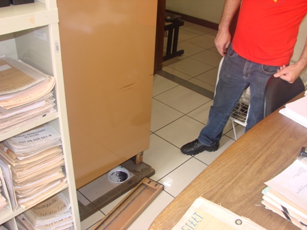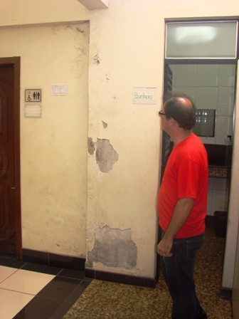 Sandra ressaltou que este quadro prejudica a todos: Servidores adoecem, Advogados são cobrados por seus clientes, e a sociedade usuária, no final das contas, é a maior prejudicada. Isto, pois espera anos e anos para ver seus processos solucionados. Durante a manifestação, o SERJUSMIG teve acesso às Secretarias (veja fotos). A situação encontrada por lá é de “caos”. Processos espalhados pelo chão, empilhados nos banheiros, atrás de portas, limitando a mobilidade dos trabalhadores. Também não há ventilação/renovação do ar adequado nas Secretarias, são poucos aparelhos ventiladores que apenas “espalham” o ar quente pelo ambiente. O estado dos banheiros é ainda mais precário: o único banheiro do prédio disponível ao público é MISTO. Não há distinção entre masculino/feminino. Os outros banheiros do Fórum estão, há meses, fechados em manutenção. Toda esta situação coloca em risco a saúde dos servidores e usuários dos serviços, sendo que até fezes e urina de ratos são percebidas por toda a parte, juntamente com ratoeiras espalhadas nas Secretarias.