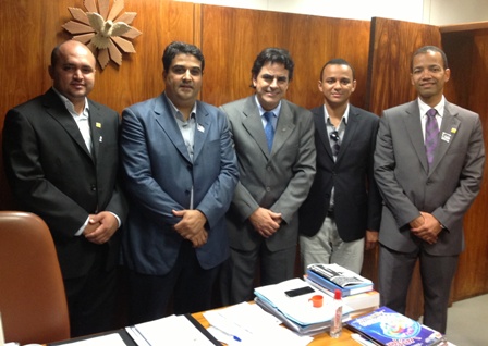 BRASÍLIA – Desde a terça-feira, 12/3/2013, o 1º Vice-Presidente do SERJUSMIG, Luiz Fernando Souza, está na Capital Federal para tratar de assuntos pertinentes aos Servidores do Judiciário da 1ª Instância, bem como realizar articulações em prol dos interesses da NOSSA Federação Nacional (Fenajud). Na terça, 12/3, Luiz Fernando participou de uma reunião dos membros da diretoria da Fenajud (foto acima), que contou com a presença do deputado federal Josias Gomes (PT-BA) para discutir estratégias de luta da Federação em prol dos Serventuários da Justiça nos Estados de todo o País. Em seguida, foi a vez do NOSSO 1º Vice-Presidente marcar presença no Conselho Nacional de Justiça (CNJ), onde agendou reuniões com os conselheiros da Casa. Na sequência, Luiz Fernando esteve com o deputado federal e presidente do Partido dos Trabalhadores em Minas Gerais, Reginaldo Lopes (PT-MG), o deputado estadual Pompílio Canávez (PT-MG) e, posteriormente, com o deputado federal Padre João (PT-MG). Já na quarta-feira, 13/3, o NOSSO representante esteve com os deputados federais mineiros Weliton Prado (PT), Jô Morais (PCdoB) e Domingos Sávio (PSDB).
