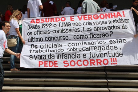Conforme informamos em nosso site, atendendo à convocação do SERJUSMIG, na terça-feira, 2/4/2013, a categoria vestiu NOSSA camiseta branca da greve, e lotou diversos locais do interior do Palácio da Inconfidência (sede da Assembleia Legislativa/ALMG, em BH), fazendo um “PLANTÃO”. Na oportunidade, de forma aguerrida, porém respeitosa, protestamos contra a não-realização da audiência pública que o SERJUSMIG solicitara em 2012 (sobre a defasagem do quadro de profissionais da Primeira Instância do Tribunal de Justiça de Minas/TJMG e, aproveitando este momento de uma GREVE HISTÓRICA no TJMG - levantaríamos outras questões relevantes para a NOSSA CAUSA). Da manhã à tarde, continuamos na ALMG, cobrando do presidente da Comissão de Administração Pública (CAP), deputado Gustavo Corrêa (PSDB), a realização da citada audiência, com definição da data (ele, entretanto, a despeito dos apelos da categoria - e de o requerimento ter sido aprovado em 2012, permaneceu, “inexplicavelmente também”, irredutível).