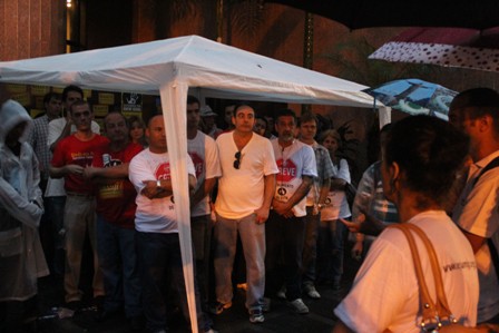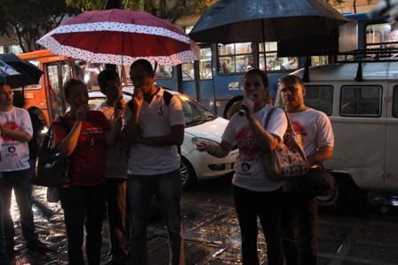Após a reunião, mesmo sob chuva, os servidores se mantiveram firmes na porta do TJMG e a presidente do NOSSO Sindicato, Sandra Silvestrini, informou a categoria sobre as últimas notícias