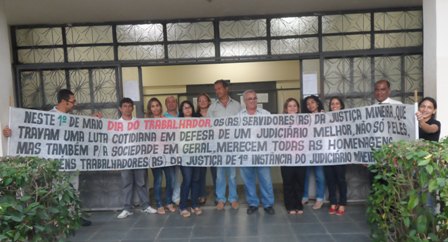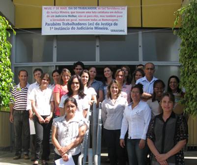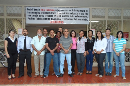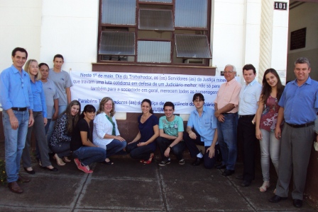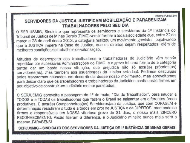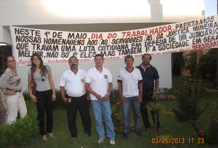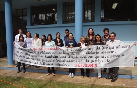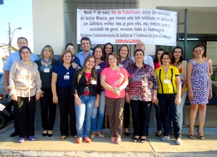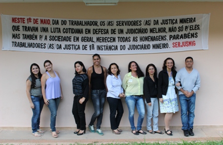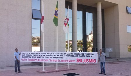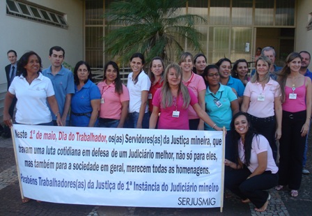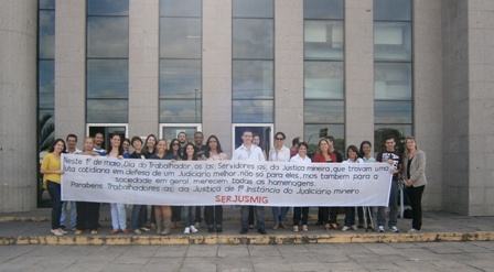 No “Dia do Trabalhador” (1º de maio), o SERJUSMIG solicitou às comarcas que exteriorizassem o orgulho e a satisfação da entidade em representar essa categoria tão guerreira, aproveitando a passagem da data para homenagear também a coragem dos lutadores e das lutadoras do Tribunal de Justiça de Minas (TJMG). Essa manifestação pública de orgulho e gratidão foi estampada em faixas patrocinadas pelo NOSSO Sindicato e também em uma nota oficial da entidade, publicada no Jornal Super Notícias do dia 1º/5/2013. Hoje, orgulhosamente, publicamos, abaixo, a nota do Jornal Super, e imagens de algumas comarcas que explicitaram a força dos servidores(as) e já enviaram ao SERJUSMIG fotos dessa merecida homenagem. Aproveitamos para, mais uma vez, parabenizar a cada uma(a), e para reiterar a todas as comarcas que desejarem ver suas imagens publicadas, que basta enviarem as fotos que teremos muita honra, orgulho e satisfação em adicioná-las aqui.