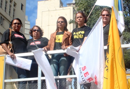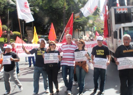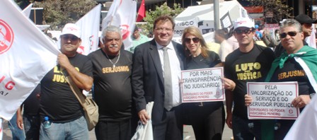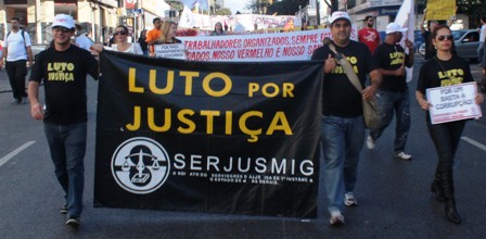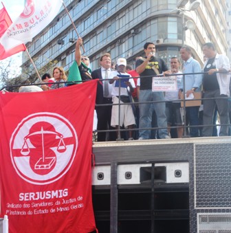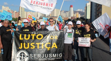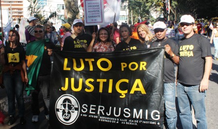 Neste 11 de julho, o SERJUSMIG se UNIU aos Trabalhadores de todas as áreas e também a lideranças dos Movimentos Sociais para dizer não à terceirização; defender o combate à corrupção e o fim da criminalização dos movimentos sociais e sindicais; gritar pela democratização e a transparência nas contas do Judiciário; e pela valorização dos servidores públicos ativos, e em especial, dos proventos dos aposentados. Enfim, estivemos nas ruas levantando a voz dos Servidores do Judiciário, que, tal qual às demais vozes do movimento, só querem JUSTIÇA, RESPEITO e VALORIZAÇÃO. (Incluída em 12/07/2013 às 09:08)