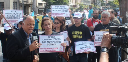 A presidente do SERJUSMIG, Sandra Silvestrini, concedeu entrevista ao Programa Segurança e Cidadania, que fez a cobertura do movimento. Sandra explicou a presença dos Servidores(as) do Judiciário no protesto, ressaltando que todo o funcionalismo de Minas, independentemente do Poder ou Órgão em que o profissional está lotado, é composto por TRABALHADORES, que sofrem com problemas muito similares e isso, por si só, já justifica a união. Afinal, o interesse em melhorias no serviço público é comum a todos. Ela também criticou a criminalização dos movimentos sindicais e sociais, relembrando a tentativa de se julgar ilegal e impor multa aos trabalhadores do Tribunal mineiro (TJMG) na recente greve de 31 dias.