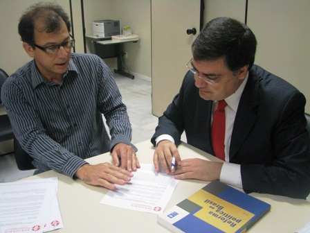 Na manhã desta terça-feira, 27/8/2013, o vice-presidente do SERJUSMIG, Rui Viana, esteve na Assembleia Legislativa de Minas Gerais (ALMG), onde se reuniu com o deputado Lafayette de Andrada (PSDB) para entendimentos a respeito do Projeto de Lei (PL) 3342/12, que dispõe sobre a criação de cargos no âmbito do Judiciário mineiro (320 cargos de Gerente de Contadoria; 1.237 cargos de Gerente de Secretaria; e 130 cargos de Assessor Judiciário). A matéria está em tramitação na Comissão de Fiscalização Financeira e Orçamentária (FFO) sob a relatoria de Lafayette. Na oportunidade, Rui reapresentou as NOSSAS emendas, já discutidas com a assessoria do parlamentar. |