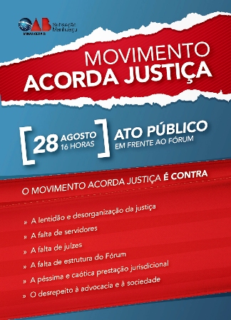 Nesta quarta-feira, 28/8/2013, o Conselheiro Fiscal do SERJUSMIG Antônio Costa dos Santos Júnior, acompanhado do funcionário Franklin Almeida (Presidência/filiação) comparece à Comarca de Ipanema para participar de um Ato público em frente ao prédio do Fórum da cidade. O protesto, que será realizado às 16 horas, visa a chamar a atenção para os problemas da comarca, como falta de pessoal, excesso/acumulo de processos, más condições de trabalho e afins. Situações vividas pela maioria das comarcas da Primeira Instância do Tribunal de Justiça de Minas Gerais (TJMG). A atividade faz parte das ações do ”Acorda Justiça”, movimento sincronizado pela Seção Manhuaçu da Ordem dos Advogados do Brasil (OAB) em cinco comarcas da regional: Manhuaçu, Ipanema, Manhumirim, Mutum e Lajinha. |