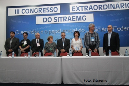O SERJUSMIG, representado por Luiz Fernando Souza, (1º Vice-Presidente) participou do “3º Congresso Extraordinário do Sindicato dos Servidores da Justiça Federal em Minas Gerais (Sitraemg)”, realizado no Tauá Resort Caeté entre sexta-feira e domingo (25 a 27/10/2013). Na programação, palestras sobre aposentadoria, dívida pública, terceirização, saúde e qualidade de vida do servidor público e Processo Judicial Eletrônico (PJe), entre outros temas de alta relevância para a NOSSA categoria. |