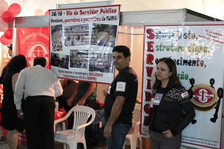 O SERJUSMIG, representado pelos vice-presidentes Rui Viana e Luiz Fernando Souza; e pela diretora financeira, Tatiana Correia Borges, prestigiou, na sexta-feira (1º/11/2013), o Show de Talentos dos servidores, na atividade promovida pelo Tribunal de Justiça de Minas (TJMG), no Fórum Lafayette (Belo Horizonte), em Homenagem ao Dia do Servidor Público (28 de outubro). Na oportunidade, NOSSO Sindicato, que manteve um estande interativo no local, prestou informações aos servidores, distribuiu prêmios aos talentos do Judiciário que, reconhecidamente, eram homenageados pela passagem do SEU dia, mas que (sabemos bem) merecem muito mais. Merecem, sobretudo, respeito e valorização profissional! E isto o SERJUSMIG deixou claro nas faixas (veja foto abaixo) que afixou no Fórum; nos banneres expostos em nosso estande e nos adesivos distribuídos à categoria antes e durante essa homenagem oficial do TJMG (adesivos que também foram enviados a todos/as os/as Delegados/as Sindicais, que também foram orientados e autorizados a confeccionar faixas).