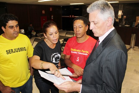 Assim que os representantes dos sindicatos chegaram à Assembleia, foram recebidos pelo deputado Rogério Correia, que recebeu os ofícios e assegurou que iria protocolar, ainda hoje, os requerimentos a ele entregues pelas lideranças sindicais. A Rogério foram entregues os ofícios contendo a reivindicação de Audiências Públicas para tratarem sobre os dois Projetos na Comissão de Administração Pública da ALMG. Em seguida, os representantes dos servidores protocolaram, no gabinete do deputado André Quintão, ofício que solicita ao parlamentar a realização de Audiência Pública sobre o PLC59/2014 na Comissão de Participação Popular da ALMG, da qual é presidente.