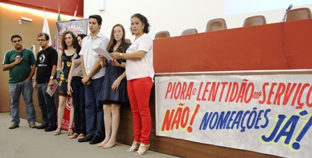 Alguns colegas que lutam corajosamente pela efetivação dos aprovados em concurso público vigente prestigiaram o encontro. Por volta do meio-dia eles chegaram ao auditório carregando uma faixa com dizeres em defesa da posse e solicitaram à direção sindical e aos colegas presentes apoio nesta luta, que, como todos compreendem, não é só deles, mas de toda a categoria. Isto porque, no caso de dispensa destes trabalhadores (aprovados em concurso público que vence em janeiro de 2015), também serão sacrificados os servidores efetivos, em virtude do excesso de serviço e defasado quadro de pessoal.