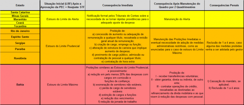 No entanto, o impacto trazido pela PEC é tão significativo que outros 5 Estados já estourarão esse limite prudencial – quando os gastos com pessoal alcançam 95% do limite máximo: Rio de Janeiro, Espírito Santo, Sergipe, Paraíba e Rondônia. A partir desse momento, os órgãos integrantes do Poder Judiciário desses Estados passam a sofrer uma série de restrições legais: concessão de aumentos salariais, criação de cargos que gerem despesas e provimento de cargos de qualquer natureza.