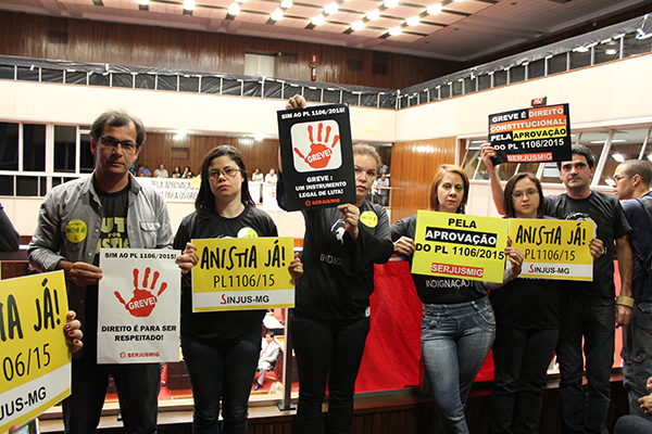 Dezenas de Servidores das duas instâncias do judiciário mineiro estiveram na tarde desta terça-feira, 23-6, na Assembleia Legislativa de Minas Gerais - ALMG para pressionar os deputados pela inclusão do PL1106/2015, que concede anistia aos servidores da 2ª Instância do Tribunal de Justiça de Minas Gerais, que participaram da greve ocorrida em 2011, na pauta da Comissão de Administração Pública - CAP. O PL teve parecer pela aprovação em plenário aprovado por unanimidade na Comissão de Constituição de Justiça - CCJ, mas para que siga a tramitação dentro da Casa até a votação em Plenário, é necessário passar pela CAP e depois, pela Comissão de Fiscalização Financeira e Orçamentária - CFFO.