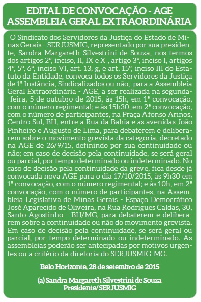 A adesão de todos os Servidores à greve do dia 5/10 é de extrema importância. A fragmentação e a desunião da categoria neste momento podem consolidar o estabelecimento de uma política de gestão no TJMG não só de não se permitir avanços em novas conquistas, como de se retirar aquelas alcançadas pelas lutas da categoria, como o Plano de Carreiras, a data-base e outras.