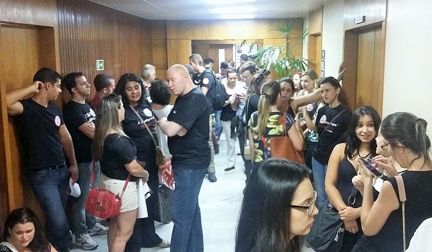 Concentrados no saguão, os Servidores permaneceram em vigília durante as várias horas de duração da reunião e, ao final, ouviram atentamente os esclarecimentos prestados pelos representantes dos Sindicatos. Todos saíram com o compromisso de se manterem firmes na luta, até a vitória final!
