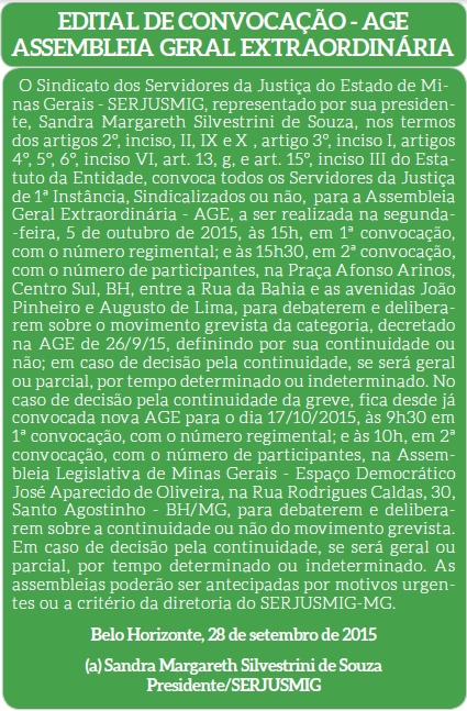 Na edição 172 do SERJUSMIG Notícias, publicado no dia 28/9/15, o SERJUSMIG divulgou o Edital das AGEs dos dias 5/10/2015 e de 17/10/2015.
