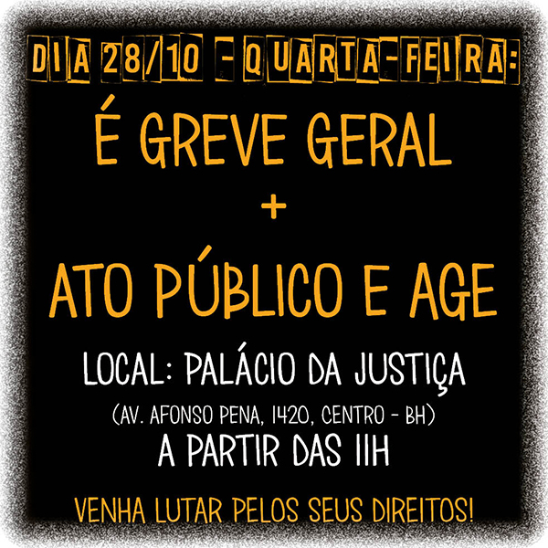 Conforme deliberado na AGE do dia 17/10, o dia do Servidor Público, 28/10, será marcado por uma GREVE GERAL, seguida de Ato Público e AGE.