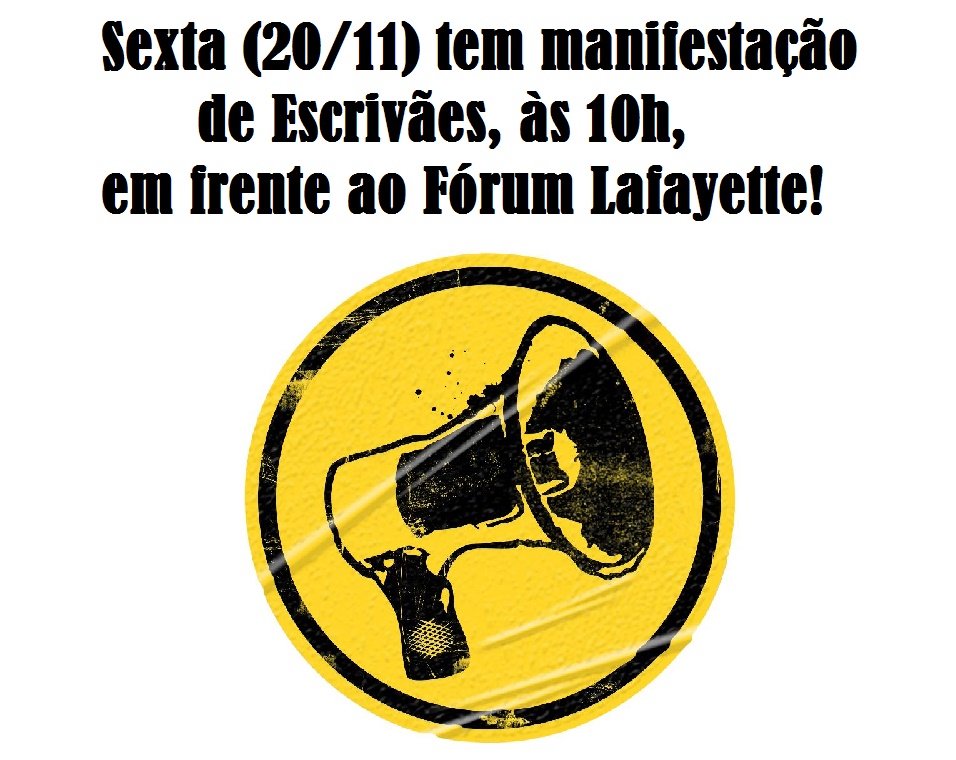 Além dos detalhes já relatados, em meio à reunião, foi sugerida por uma das escrivães a realização de uma manifestação da classe, na próxima sexta-feira, dia 20/11, em frente ao Fórum Lafayette, no horário das 11h às 12h, a fim de que o apoio dos escrivães à greve se torne público.