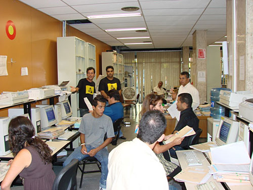 Na tarde do dia 7/5 (segunda-feira), os diretores do SERJUSMIG, Luiz Fernando Souza e Rui Viana, respectivamente, 1º e 2º vice-presidentes, e a sub-diretora financeira, Tatiana Borges, estiveram no prédio do Juizado da Infância e da Juventude de BH para informar aos servidores sobre a proposta do TJMG - contida no anteprojeto de lei que altera a Lei de Organização e Divisão Judiciárias - em incluir os idosos no rol das responsabilidades do Juizado da Infância e da Juventude e, ainda, sobre a Portaria 070/2005 e desvio de função.