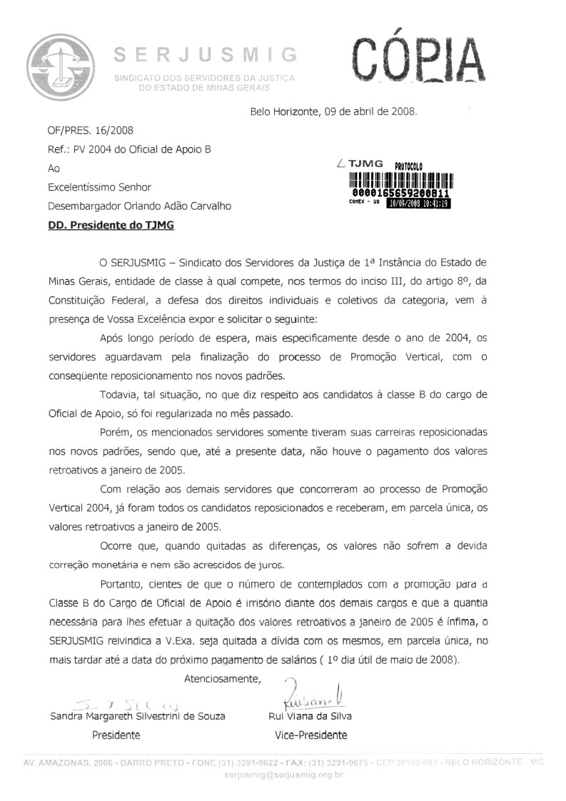 No dia 09 de abril, através de ofício que encaminhou ao presidente do TJMG, des. Orlando Adão, o SERJUSMIG reivindicou o pagamento urgente (no mais tardar no próximo pagamento – 1º de maio), dos valores retroativos a 1º de janeiro de 2005, referente aos servidores classificados na PV 2004 para a Classe B do Cargo de Oficial de Apoio.