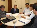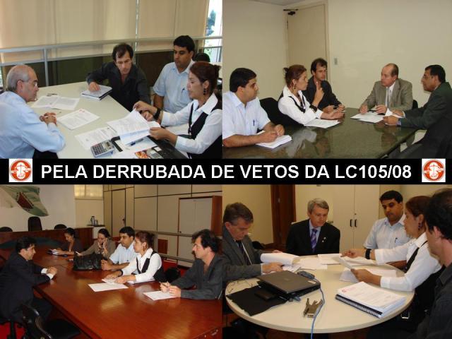 O dep. Elmiro Nascimento, por sua vez, também se mostrou solidário à causa dos servidores e manifestou seu apoio. Neste sentido, alem de elogiar o trabalho desenvolvido pelo SERJUSMIG relativo à documentação que sustenta a derrubada dos vetos, o parlamentar manifestou disposição em trabalhar por um consenso, envolvendo os órgãos competentes, a fim de viabilizar a manutenção dos artigos vetados. O deputado Ivair Nogueira também recebeu os diretores do SERJUSMIG e se mostrou sensível as reivindicações dos servidores. Disse que a categoria poderia contar com seu apoio. Ao chegar ao gabinete do deputado Dalmo Ribeiro, o SERJUSMIG pôde sentir os primeiros resultados do trabalho, pois este já estava ciente do material elaborado pela entidade. Dalmo também teceu muitos elogios ao material, e disse que já havia sido procurado instante antes do início da reunião pelos deputados Ademir Lucas e Elmiro Nascimento. Segundo Dalmo, os colegas comentaram sobre a reunião que tiveram com o SERJUSMIG e traçaram algumas estratégias de atuação em favor dos artigos defendidos pelo sindicato. Logo a seguir, continuando o trabalho, o SERJUSMIG reuniu-se com o deputado Doutor Viana, o qual, prontamente, também manifestou seu apoio e prometeu fazer a defesa em plenário da derrubada dos vetos. Por último, foi a vez do Líder do Governo, dep. Mauri Torres, o qual, embora justificando sua impossibilidade de votar contra o Governo, prometeu dialogar com setores do Executivo acerca do impasse causado a partir dos vetos.
