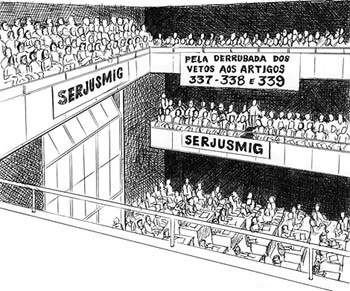 O SERJUSMIG continua fazendo plantão na Assembléia Legislativa do Estado de Minas Gerais. A qualquer momento, os vetos do Governador aos artigos 337, 338 e 339 da Lei de Divisão e Organização Judiciárias (sugeridos pelo SERJUSMIG) poderão ser votados. São 21 vetos que sobrestam a pauta há mais de um mês. No sábado (14/04), o presidente da ALEMG, Dep. Antônio Júlio (PMDB), convocou, através de telegrama, todos os deputados para as reuniões extraordinárias que serão realizadas a partir de hoje (17/04). O SERJUSMIG enviou, mais uma vez, ofício a todos os deputados solicitando o apoio na derrubada dos vetos. SERVIDOR, FIQUE ALERTA E ACOMPANHE AS VOTAÇÕES. JUNTE-SE A SEU SINDICATO PELA GARANTIA DE SEUS DIREITOS. (Incluída em 17/04/2001 às 15:35) |
