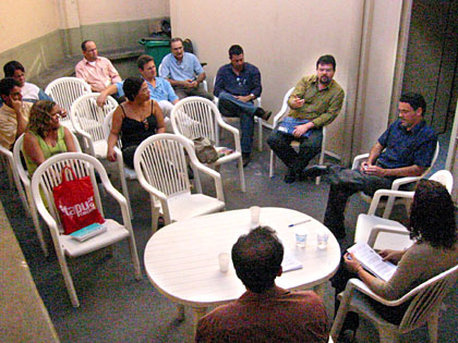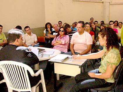 - Uma equipe de advogados do SERJUSMIG explica o ingresso de novas ações judiciais do sindicato. Os servidores presentes apóiam.  Grupo de servidores participam de assembléia na sede do sindicato