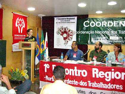 - O SERJUSMIG participou do encontro da Coordenação Nacional dos Trabalhadores do Judiciário, realizado em BH. Durante o evento foi discutido um plano unificado de lutas dos servidores do judiciário.  Sandra e representantes de outros sindicatos expõem a situação do judiciário pelo país