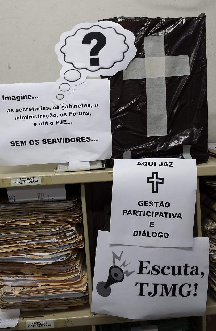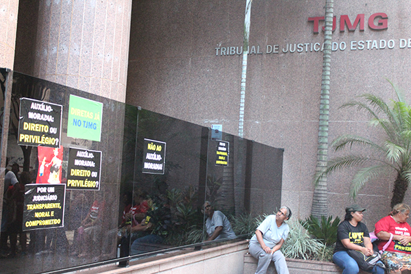 Funcionários do TJMG retiram os cartazes colados nos vidros