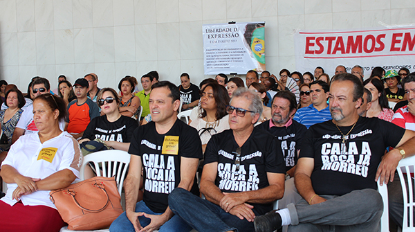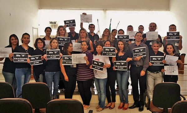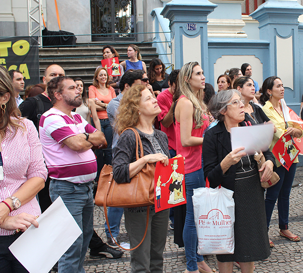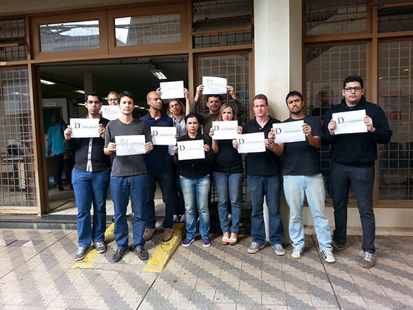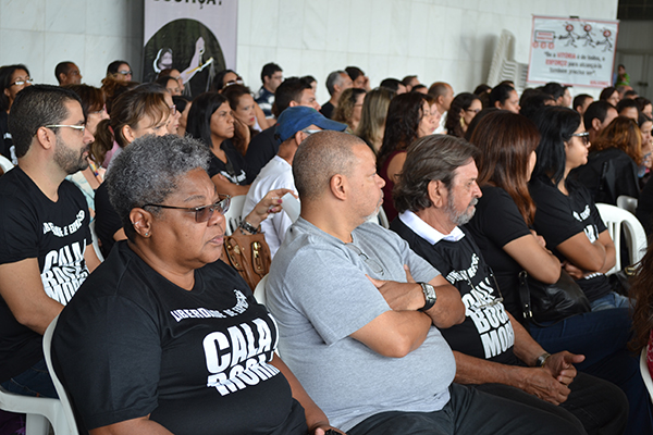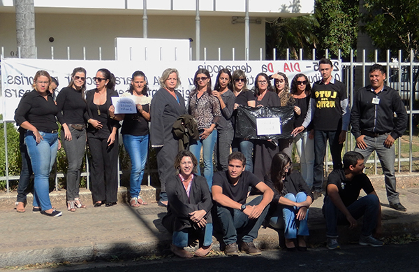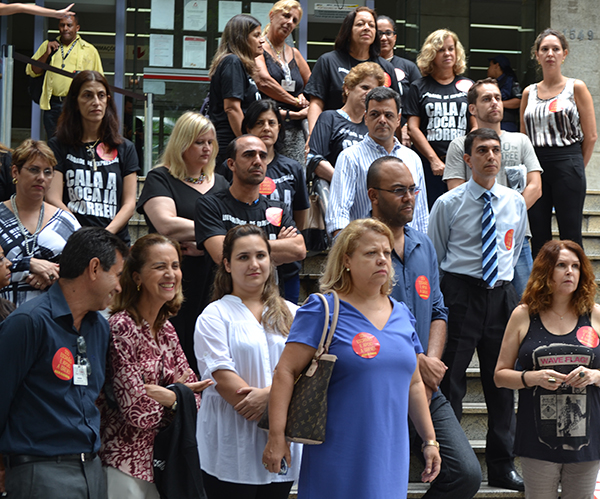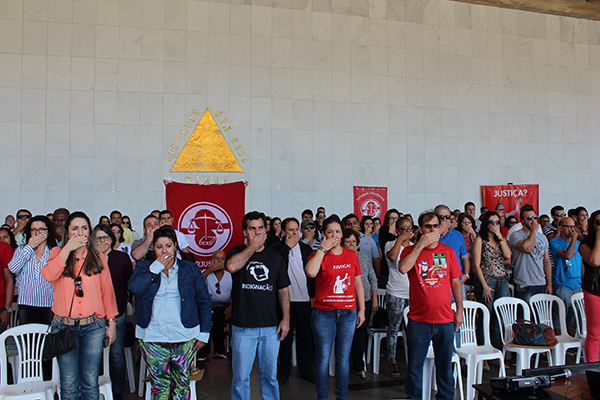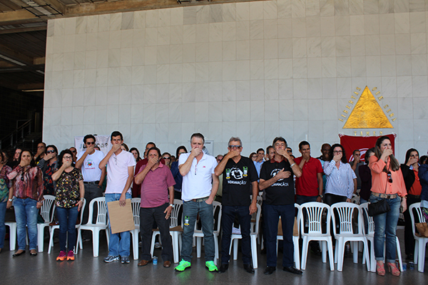 Os Servidores ouvem o Hino Nacional com a boca tampada, em protesto às ações impetradas que coibem o direito de liberdade de expressão